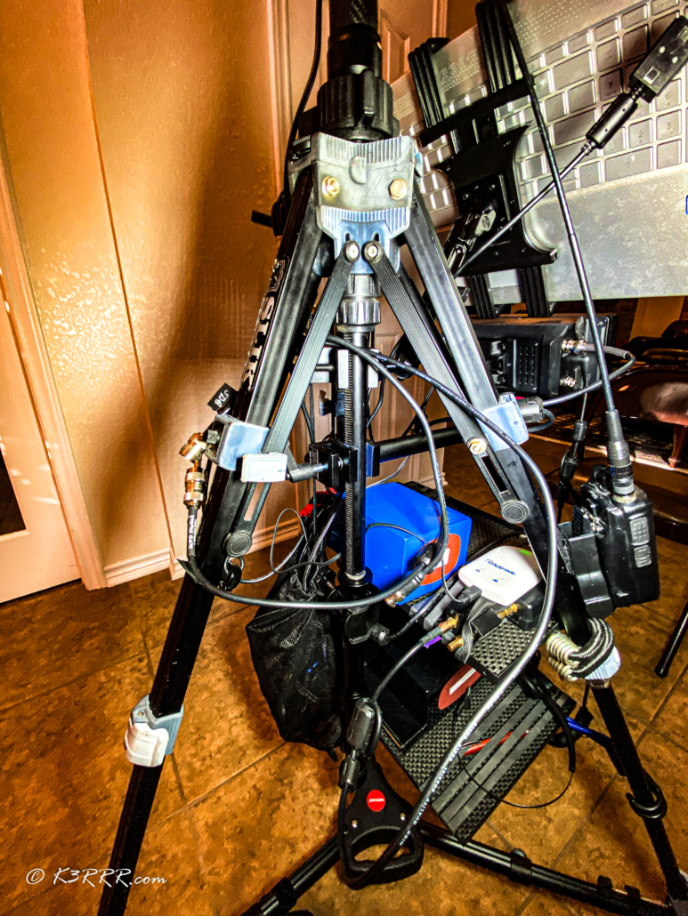 See photo. If you try this over rough terrain, I strongly suggest you put your radios in some kind of packaging or case! Also, I’m still thinking about that jump seat and motorizing the tripod so that I can just drive it around the house or out by the pool!