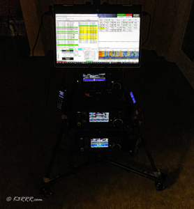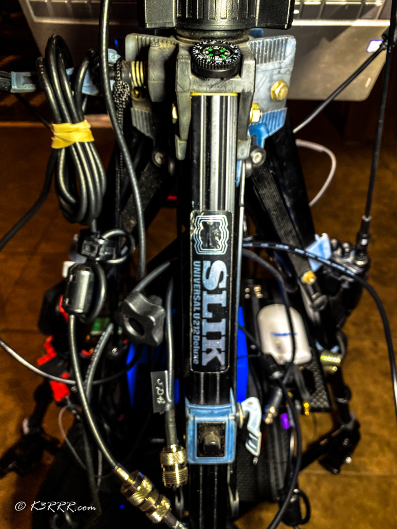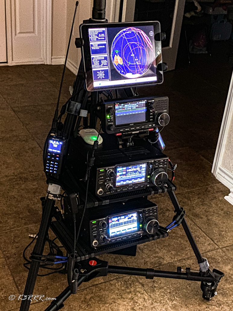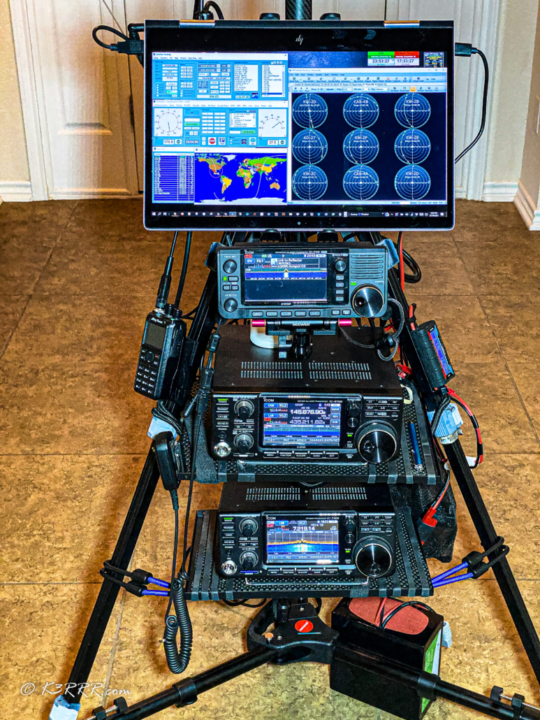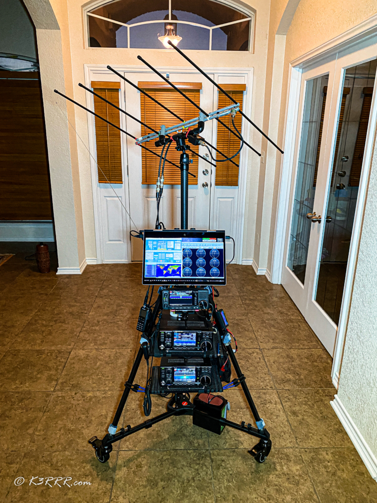 Think how cool that is to be able to wheel around your entire shack, including a power supply from Bioenno batteries, and an HF antenna mounted on a small mast attached to a camera tripod, allowing you to talk around the world.