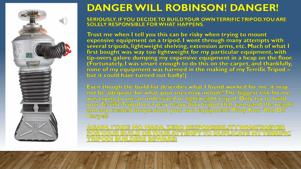 Before you dive headfirst into building your Terrific Tripod, please read this carefully. As I said in the video: Danger, Will Robinson, Danger! Seriously, you are solely responsible for what happens when you start mounting expensive equipment on a tripod. Trust me — I went through many attempts with several tripods, lightweight shelving, extension arms, and so on. Much of what I first bought was way too lightweight for my equipment, and yes, there were tip-overs galore — dumping my expensive radios into a heap on the floor. Fortunately, I was smart enough to test on carpet, and thankfully, none of my equipment was harmed in the making of my Terrific Tripod.